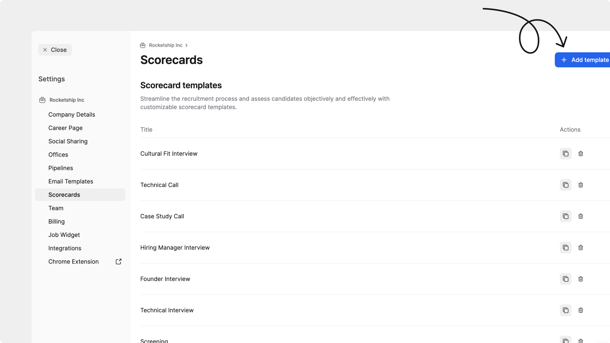 Les modèles définissent la structure de vos fiches d’évaluation. Vous pouvez les réutiliser sur plusieurs offres et processus de recrutement. Créez ou gérez facilement des modèles existants dans Paramètres → Fiches d’évaluation.