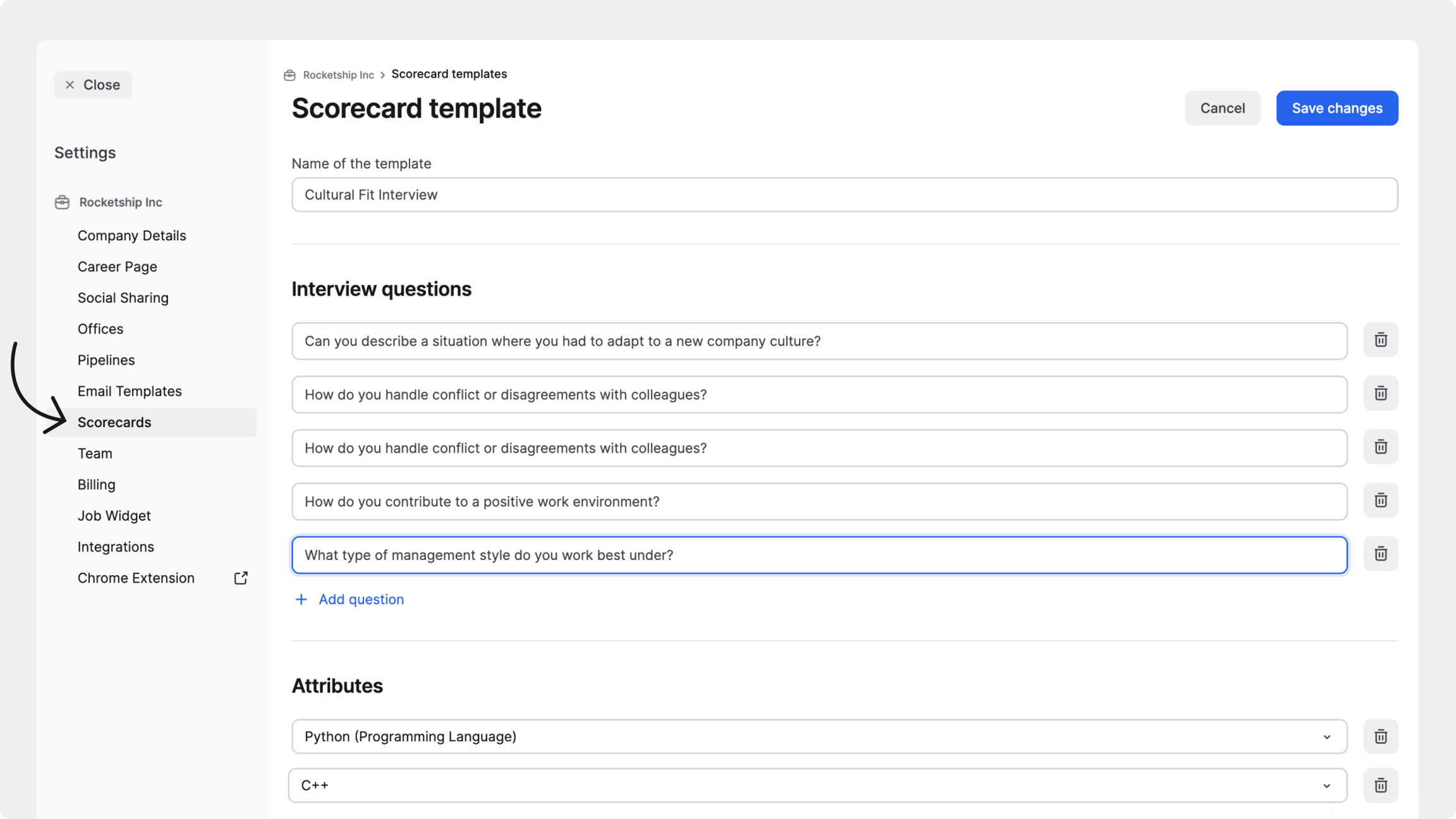 Utilisez les fiches d’évaluation dans JOIN pour évaluer les candidats de manière cohérente et collaborative, sur la base des réponses aux questions d’entretien, des attributs spécifiques au poste et de l’impression générale. Les fiches d’évaluation structurent vos entretiens, alignent les retours de l’équipe et vous permettent de prendre des décisions de recrutement en toute confiance.