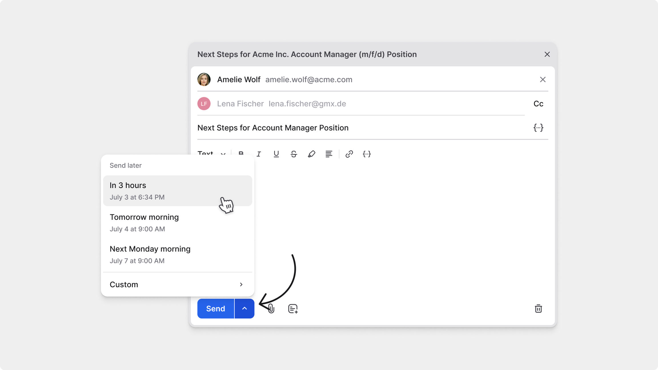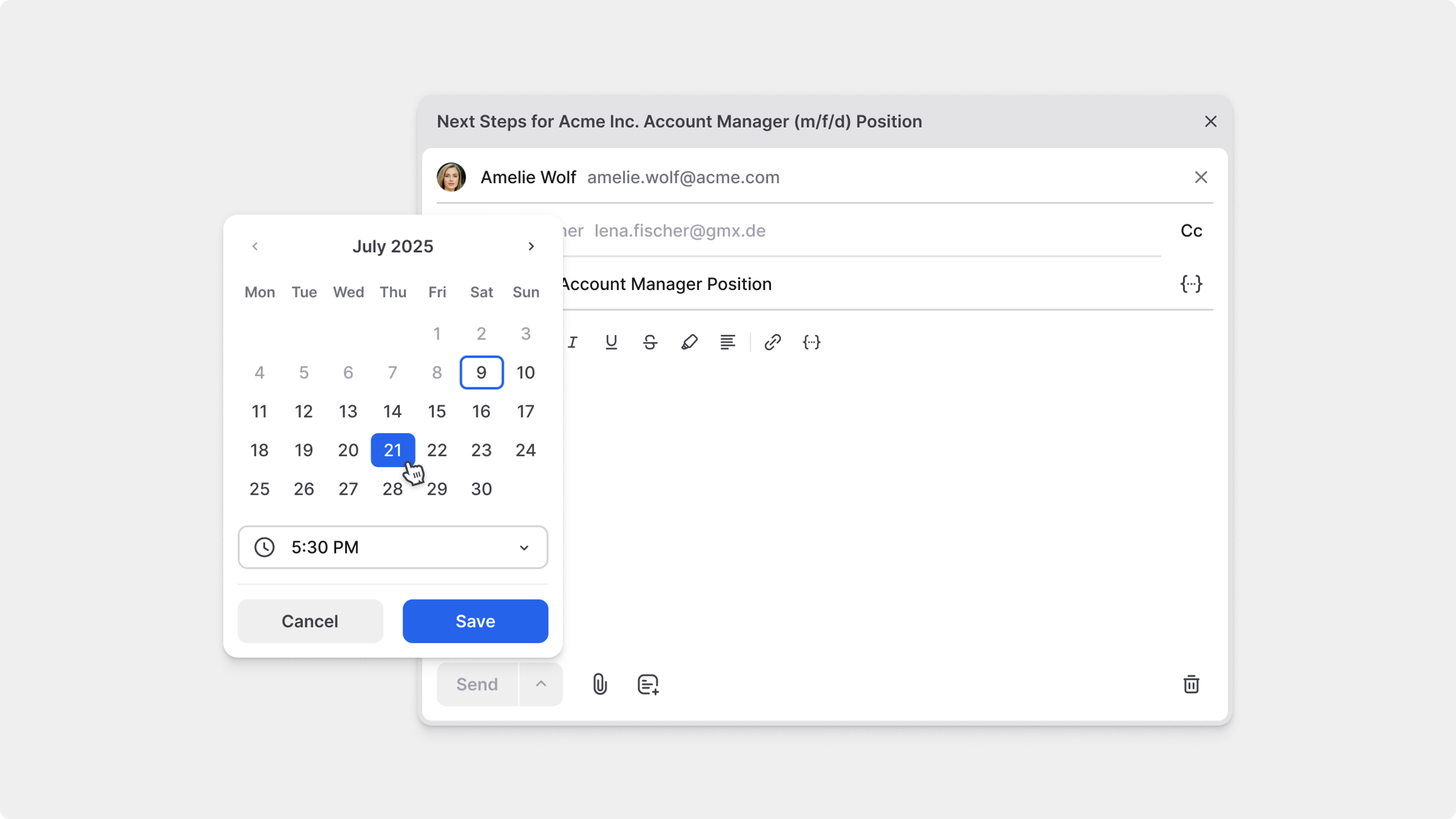 Contrôlez précisément quand vos e-mails sont envoyés, que vous envoyiez un refus, une relance ou un e-mail lié à un Entretien. Grâce à cette fonctionnalité, vous pouvez programmer l’envoi des e-mails aux candidats au moment qui vous convient le mieux, à vous comme à eux.