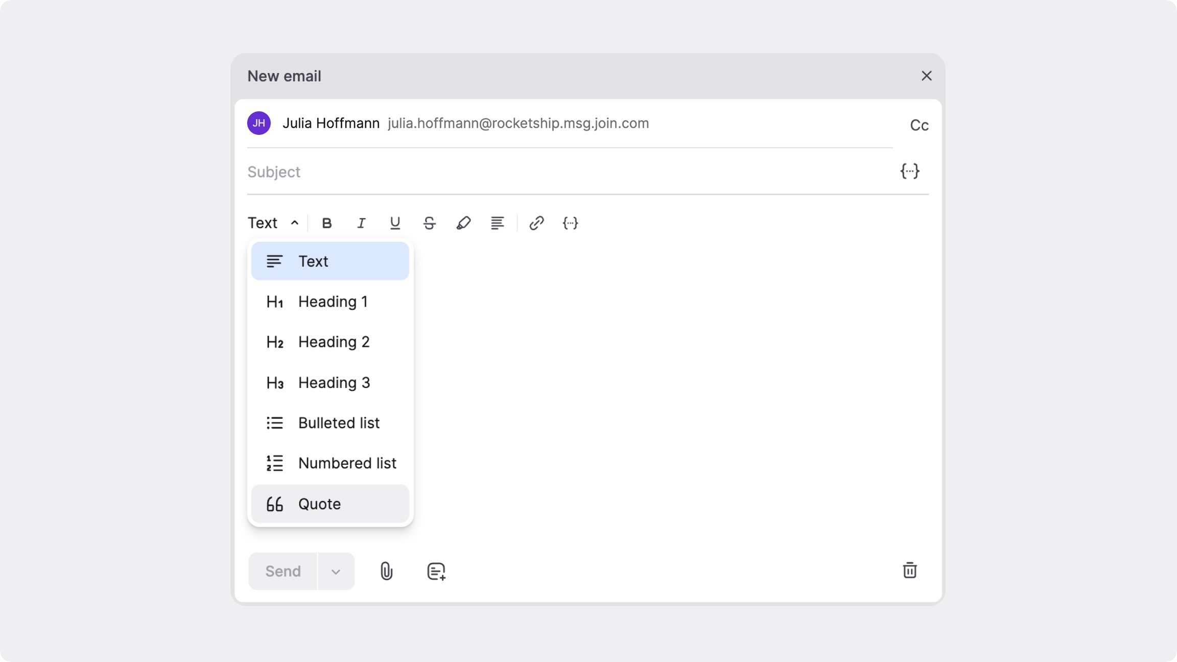 Lorsque vous rédigez un e-mail dans JOIN, vous pouvez utiliser la barre de mise en forme pour structurer et styliser votre message avec clarté. Voici le détail des options disponibles :