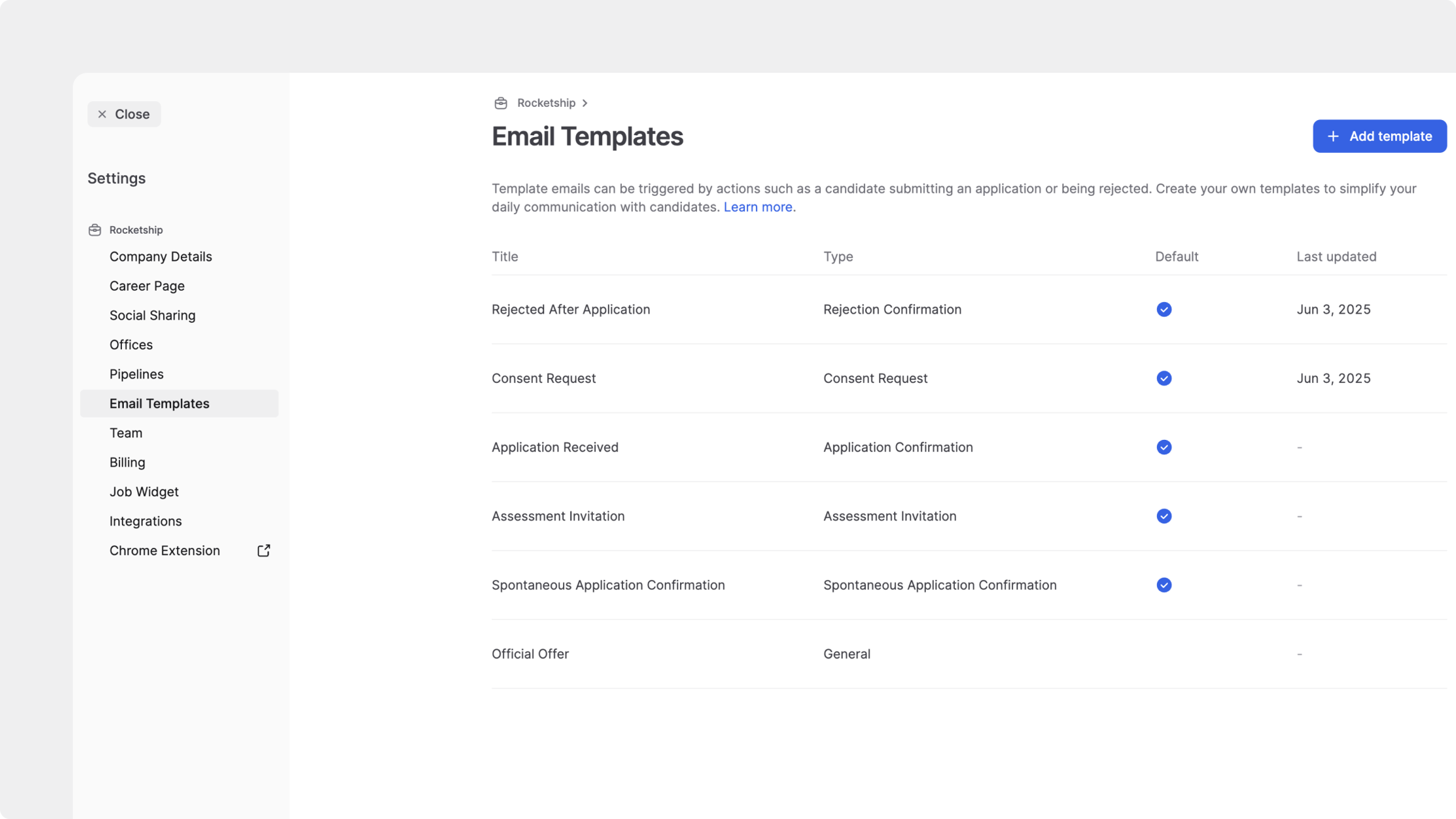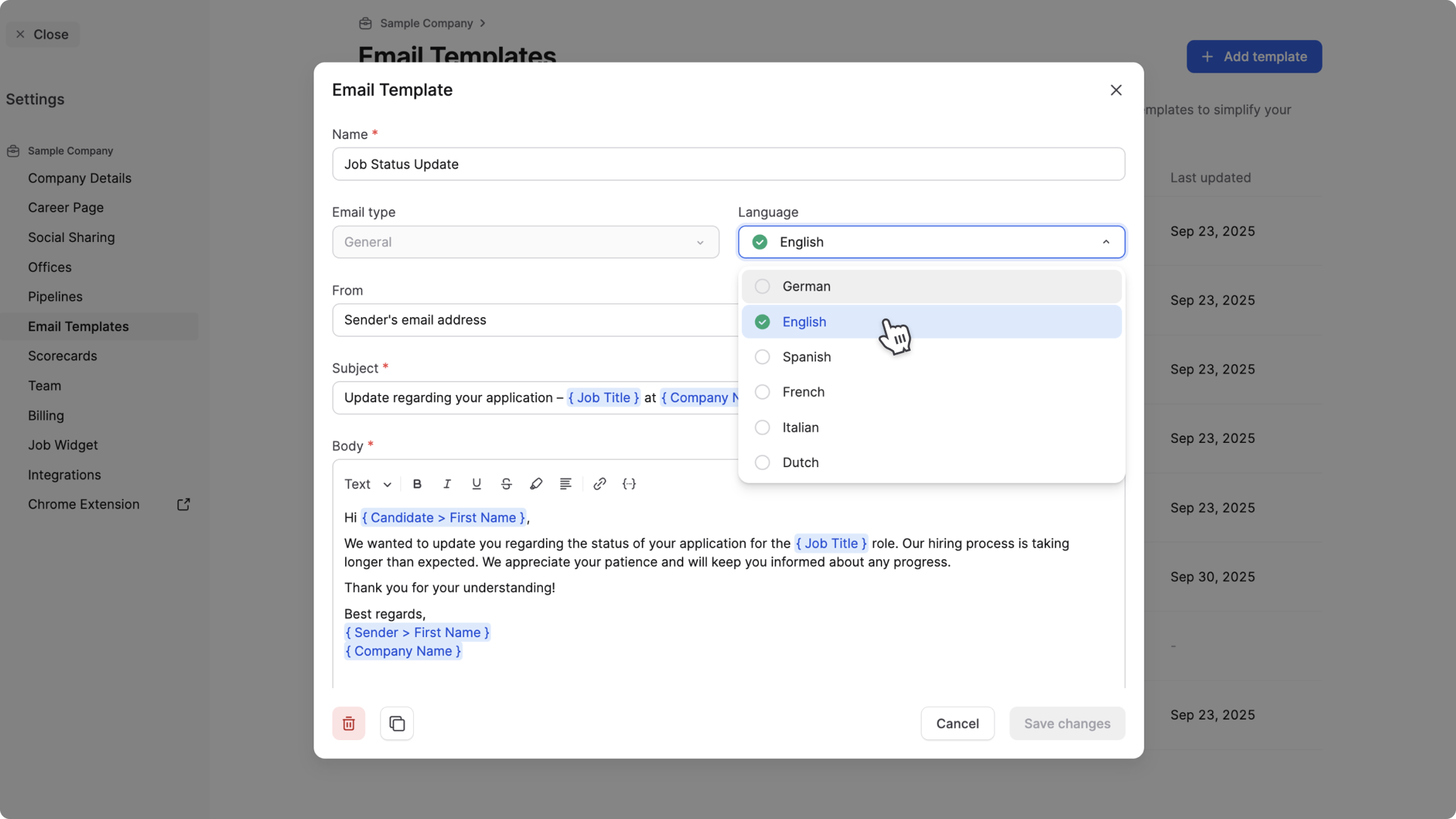 Vous pouvez créer des modèles pour différents types de communication, notamment les confirmations de candidature, les refus ou les mises à jour générales. Les modèles peuvent être créés dans plusieurs langues.