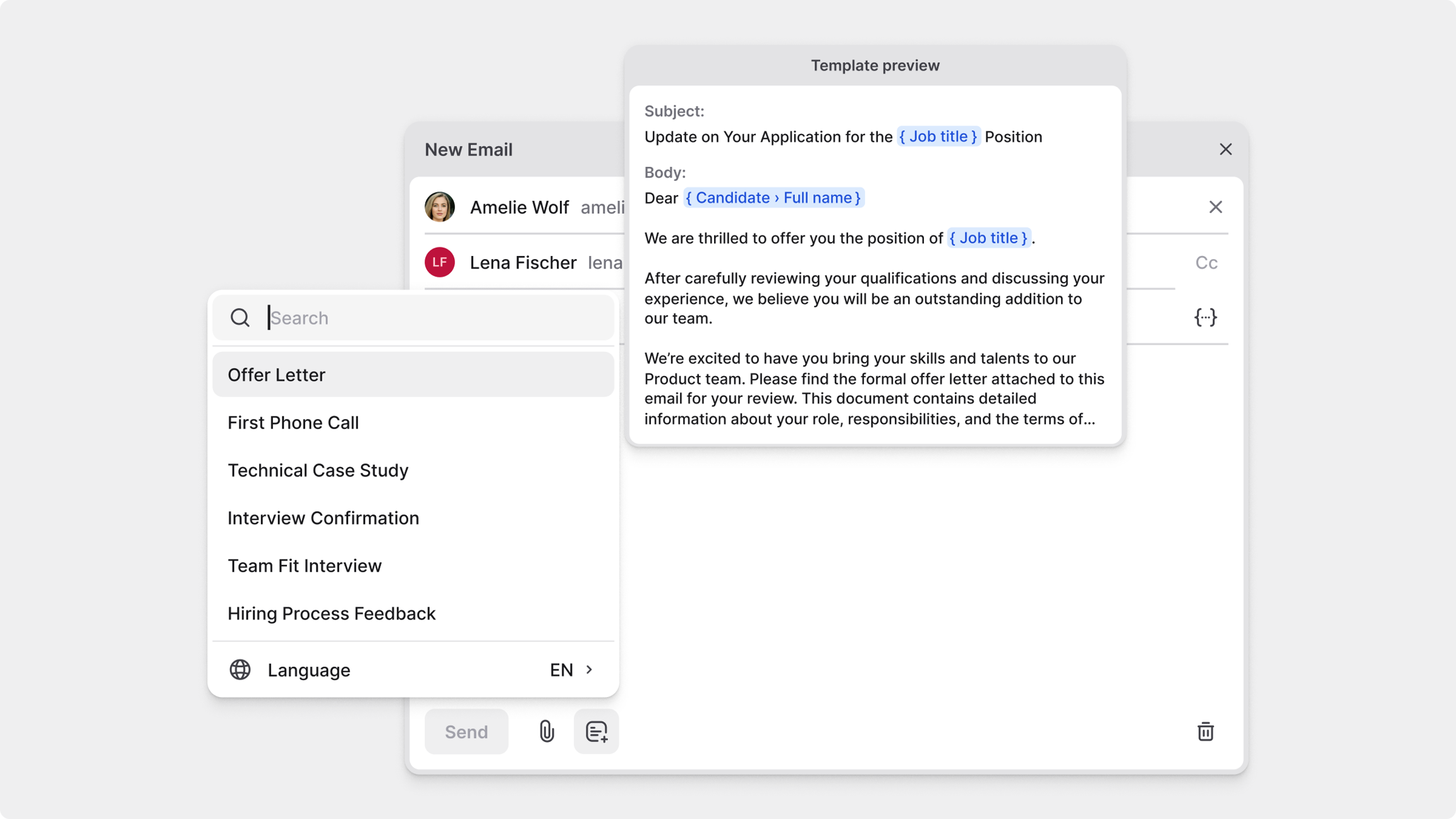 Créez et gérez des modèles d’e-mails pour communiquer avec les candidats. Utilisez des variables, des langues et des valeurs par défaut pour garder une communication cohérente.