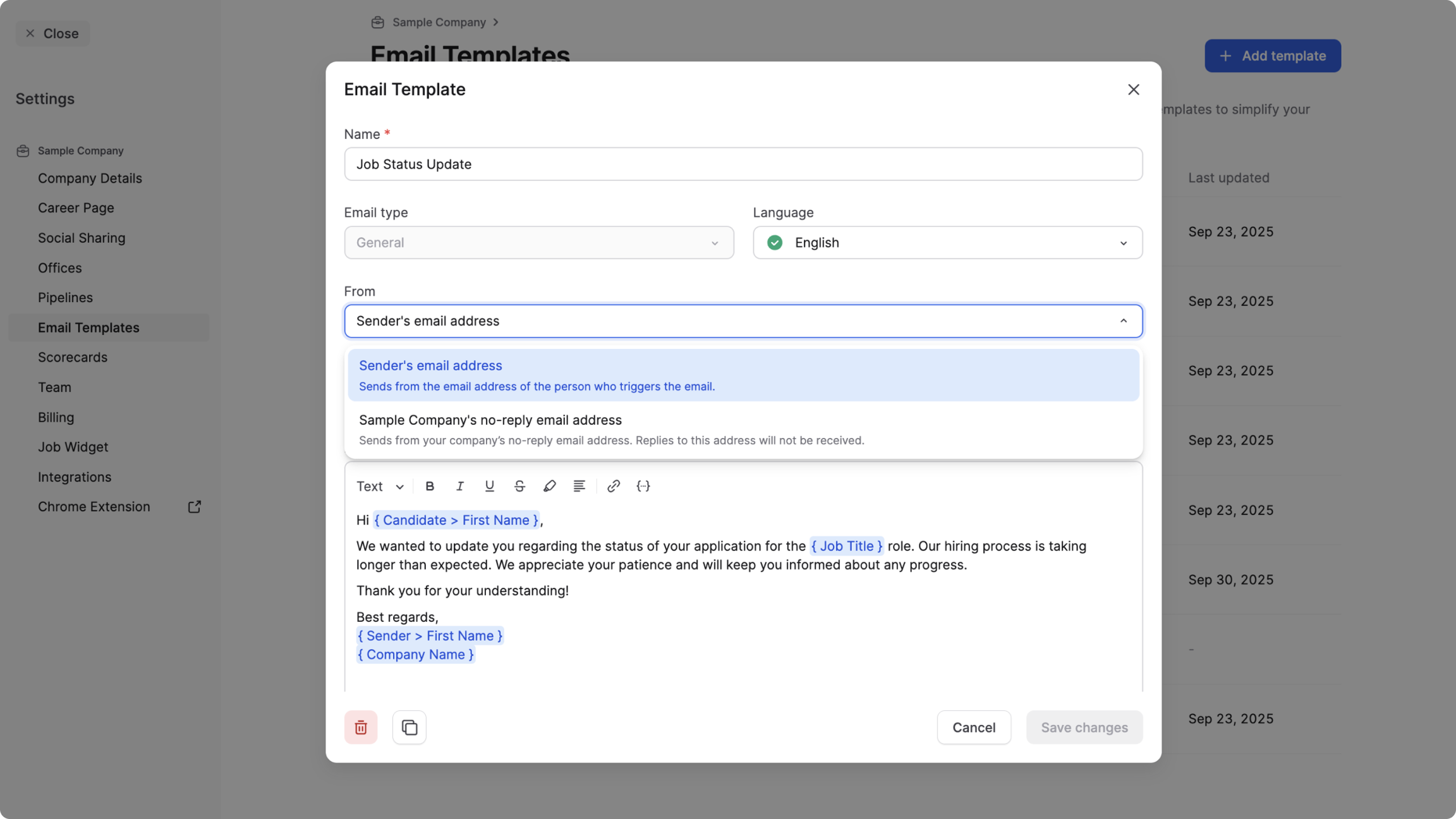 Les modèles sont entièrement modifiables lorsqu’ils sont insérés dans des e-mails individuels. Pour les refus groupés, les e-mails de refus automatiques et les confirmations de candidature, les modèles doivent être utilisés tels quels. Mettez-les à jour à l’avance dans Paramètres → Modèles d’e-mails.