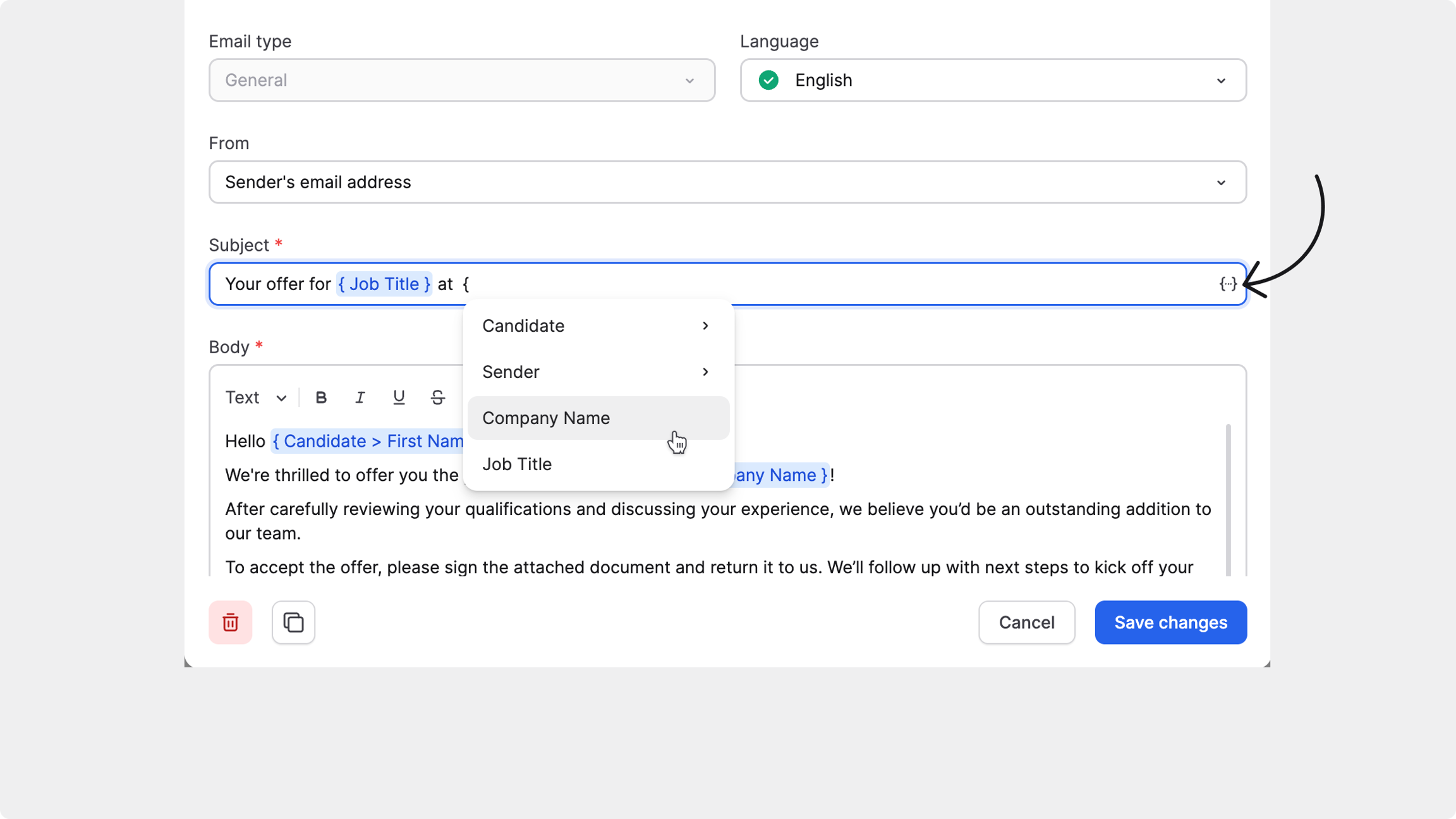 {Cela ouvrira le menu avec les variables disponibles que vous pouvez insérer dans cet e-mail. Choisissez la variable que vous souhaitez insérer. Parmi les variables courantes, vous trouverez notamment : les informations du candidat, les informations de l’expéditeur, le nom de l’entreprise, etc.
