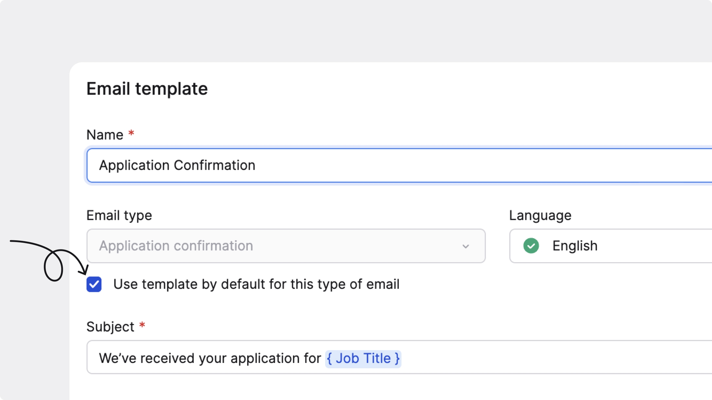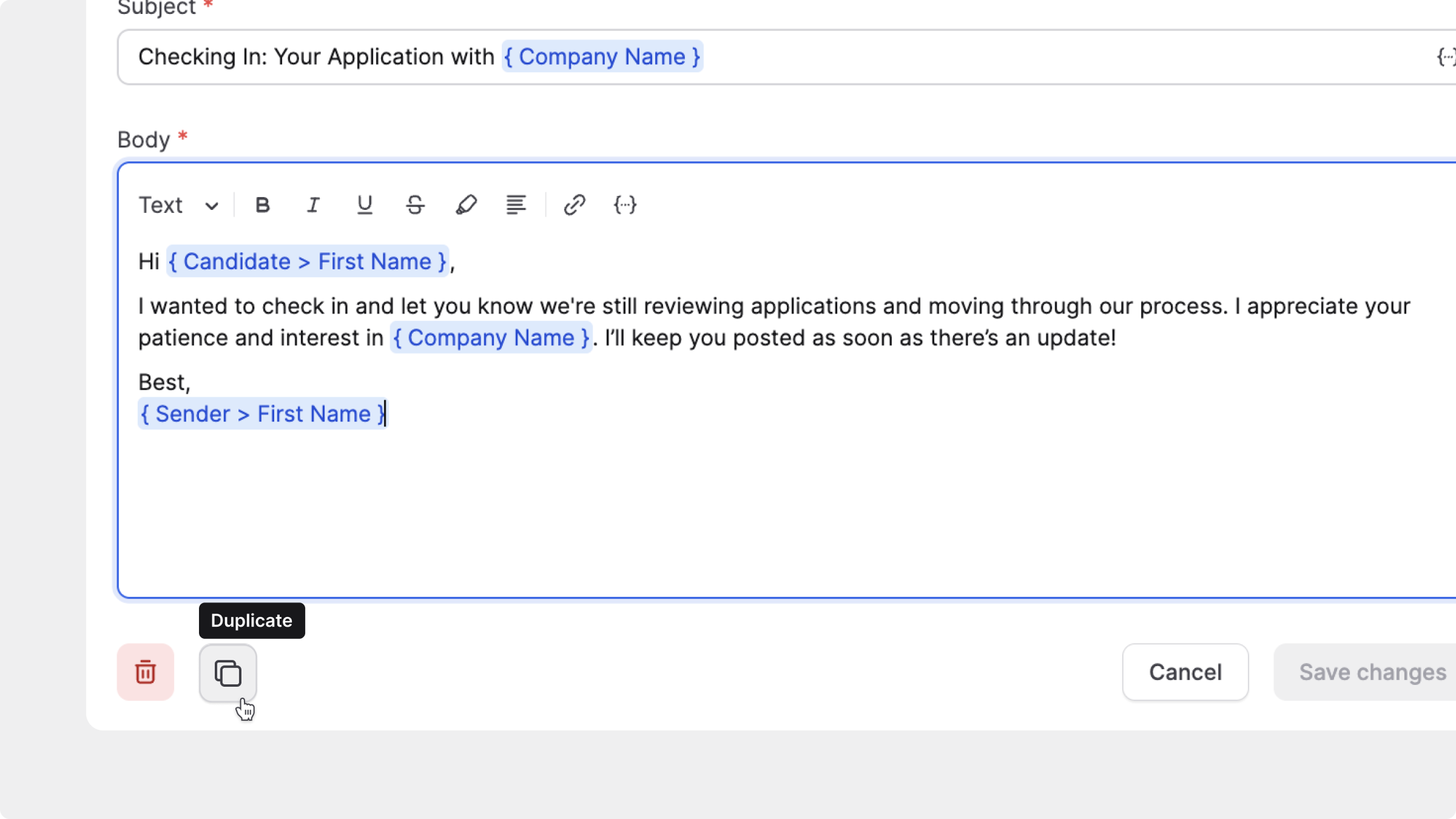 Les modèles peuvent être modifiés uniquement lorsqu’ils sont insérés dans des e-mails individuels. Pour les actions groupées, comme un rejet groupé, ou pour les e-mails automatisés, comme les confirmations de candidature, les modèles sont utilisés tels quels.