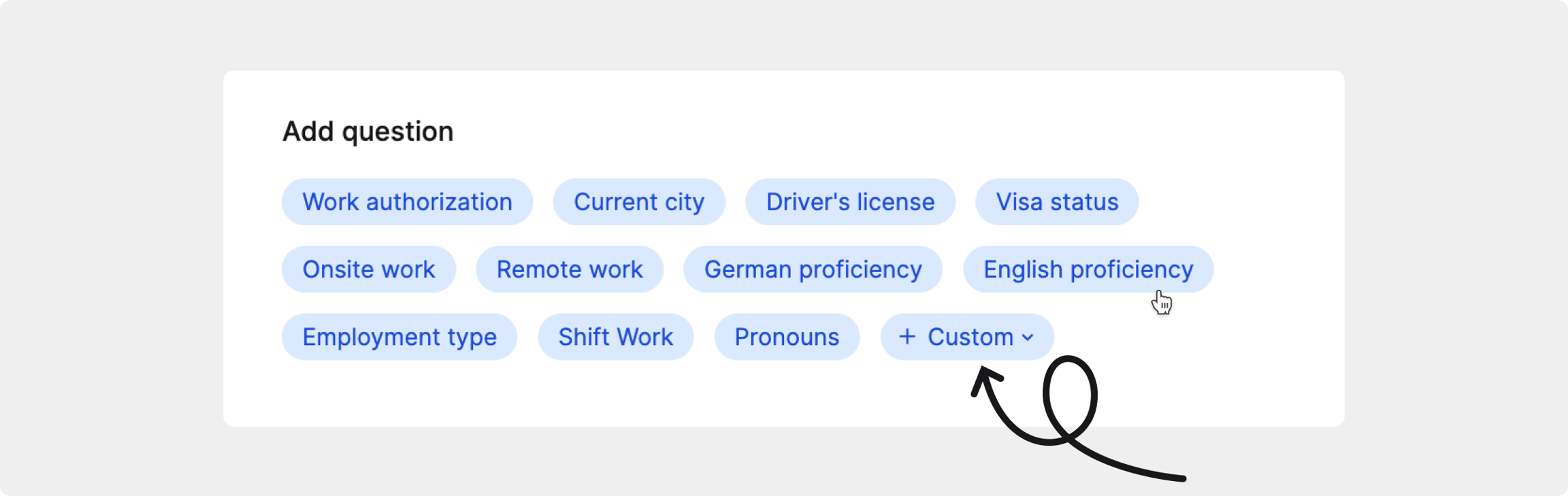 + Personnalisée, puis choisissez unType de réponse:Texte court(ne peut pas être utilisé avecÉliminatoire)Oui / NonChoix uniqueChoix multipleDateNombreTéléversement de fichier(ne peut pas être utilisé avecÉliminatoire)