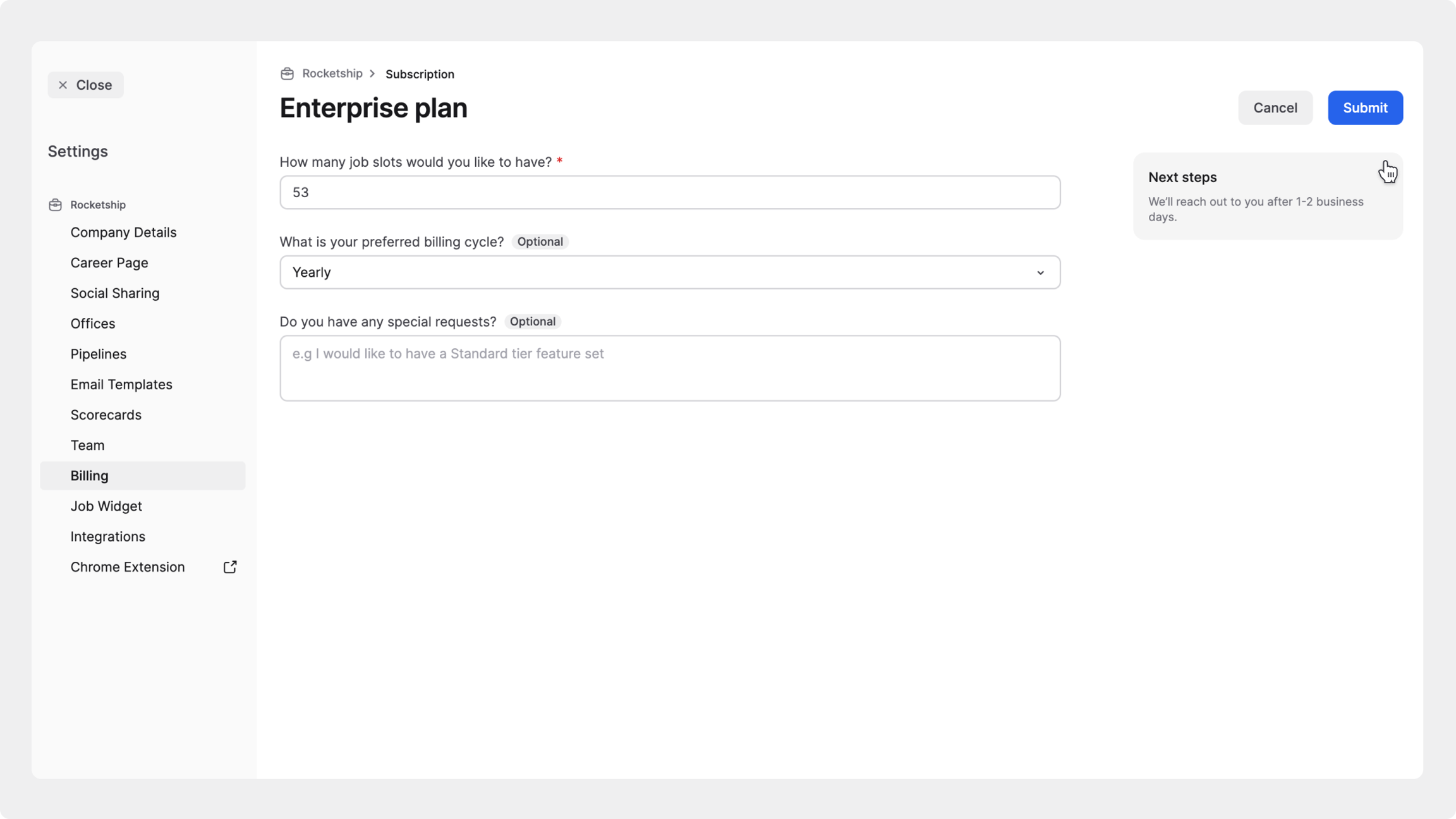 Toutes les résiliations sont planifiées pour prendre effet à la fin de votre cycle de facturation. Vous resterez sur votre abonnement actuel et conserverez l’accès à vos job slots et fonctionnalités jusqu’à ce moment-là.