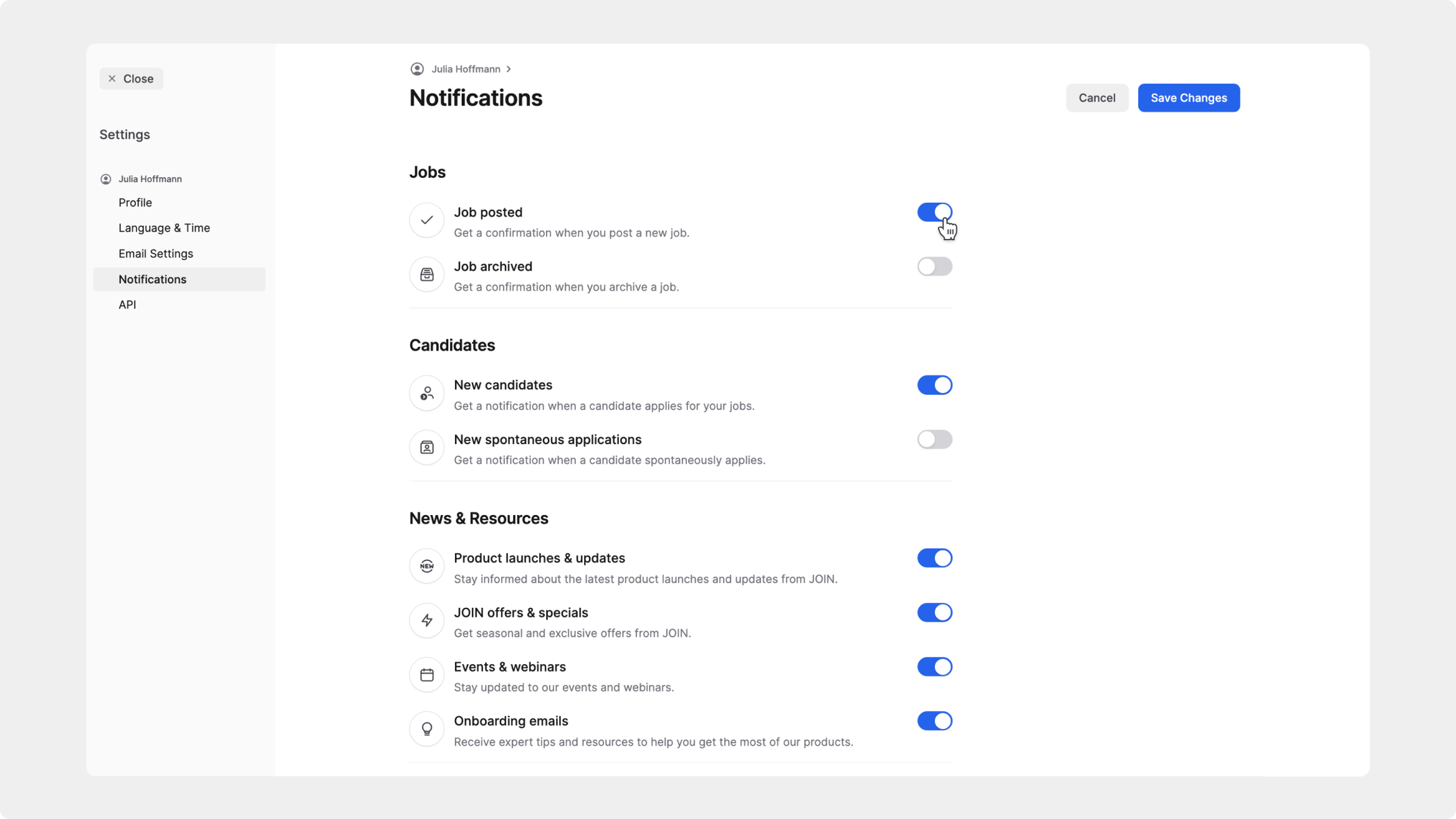 Cet article explique comment gérer vos notifications par e-mail dans JOIN afin de rester informé des activités du produit, des mises à jour sur les candidats et d’autres sujets pertinents.
