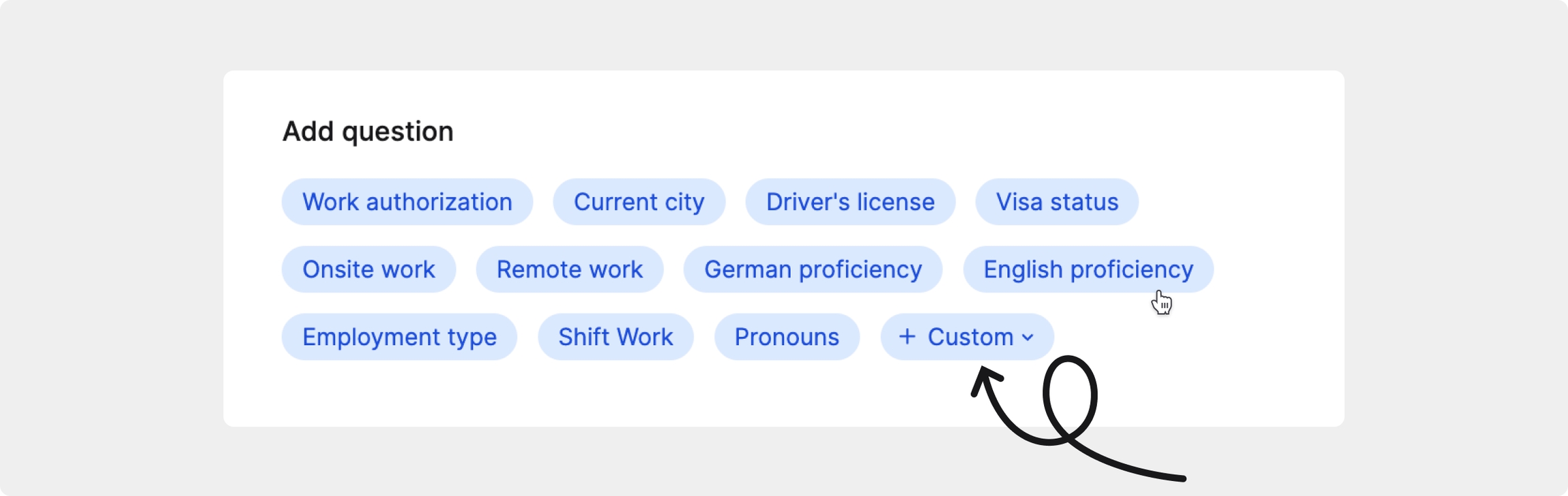 Wenn Sie eine Frage an Ihre spezifischen Bedürfnisse anpassen oder etwas fragen möchten, das hier nicht aufgeführt ist, verwenden Sie die + Benutzerdefiniert Schaltfläche, um Ihre eigene Frage zu erstellen. Benutzerdefinierte Screening-Fragen bieten Ihnen volle Flexibilität hinsichtlich Formulierung, Struktur und Antworttypen.