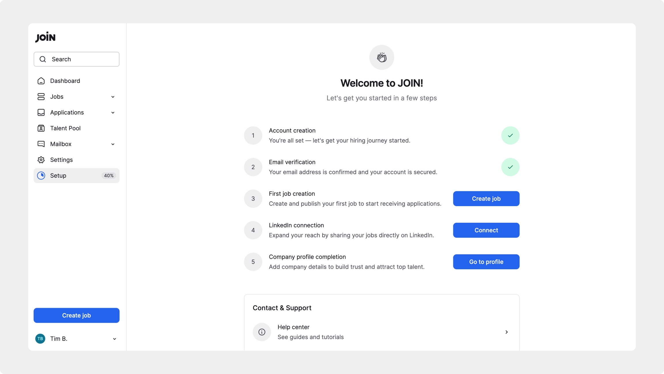 Hier können Sie Ihren ersten Job erstellen und veröffentlichen, Ihr JOIN-Konto mit dem LinkedIn-Konto Ihres Unternehmens verbinden und Ihr Unternehmensprofil vervollständigen.