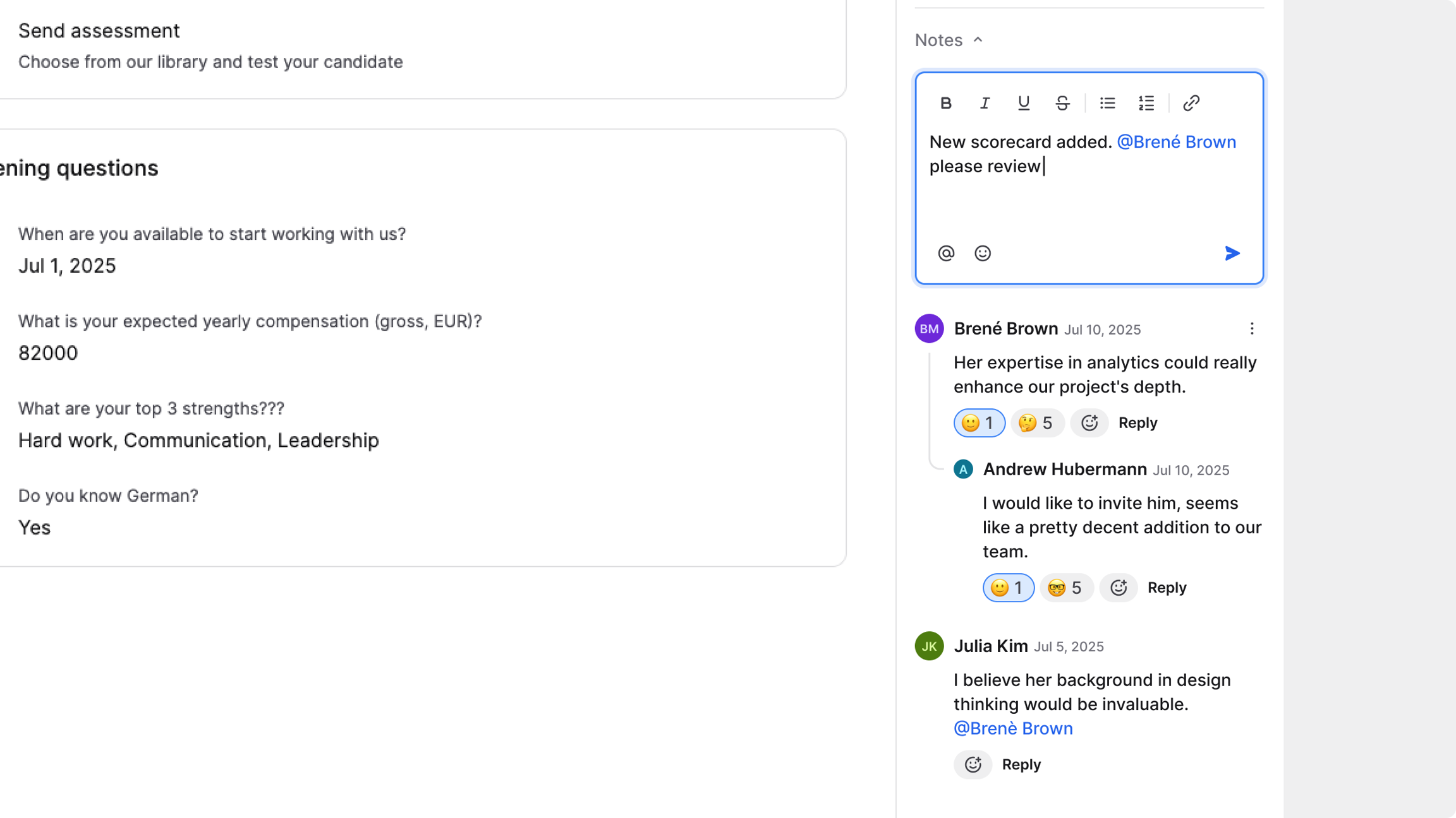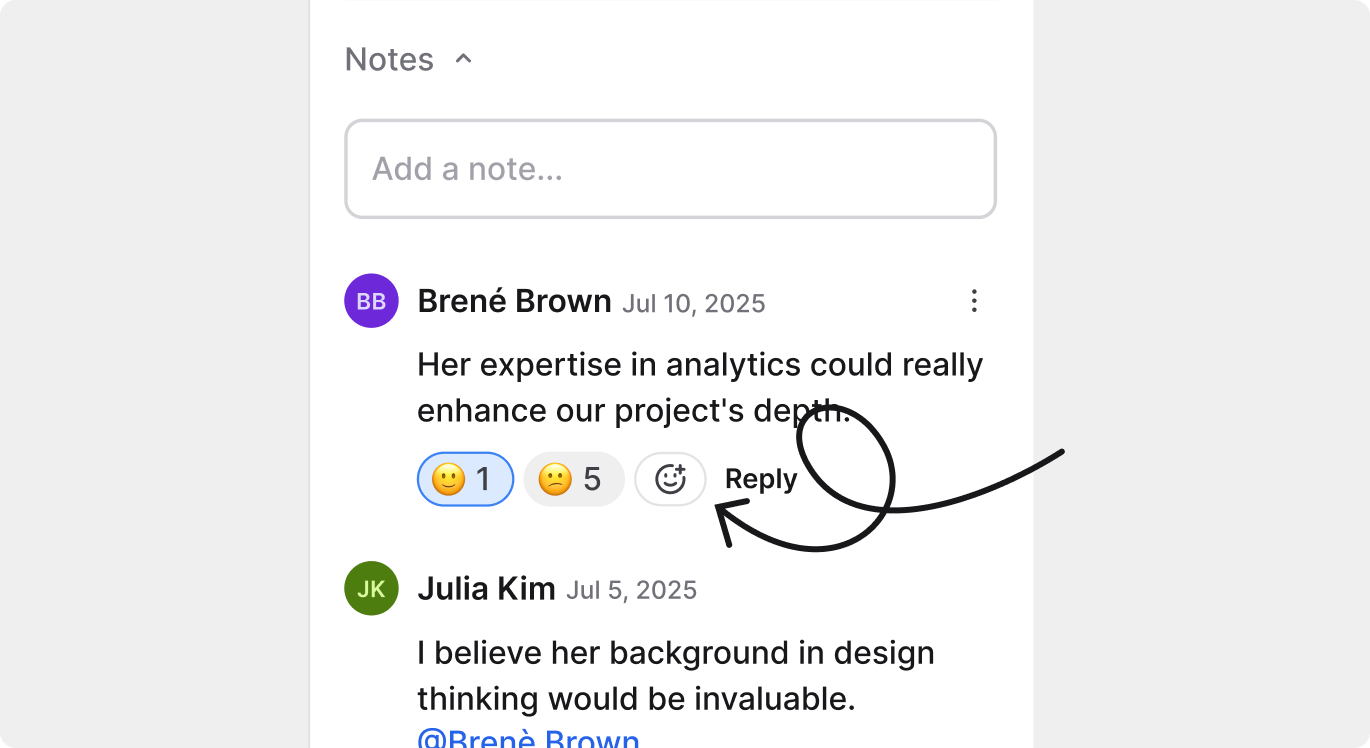 Las notas te permiten dejar comentarios internos sobre un candidato. Las notas te ayudan a hacer seguimiento del feedback, las actualizaciones internas y las conversaciones de contratación directamente en el perfil del candidato. Admiten texto con formato, respuestas en hilos, menciones y reacciones con emojis, para que el equipo se alinee rápido durante todo el proceso de contratación.
