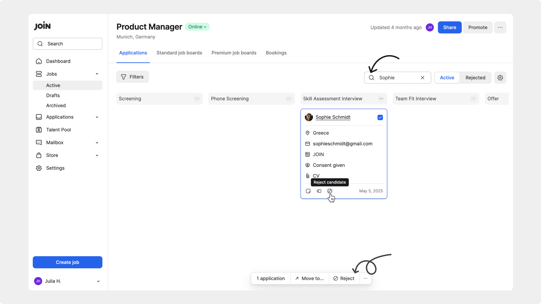Usa los filtros para acotar tu lista de candidatos o busca directamente (Command + F o Ctrl + F) al candidato que quieres rechazar.