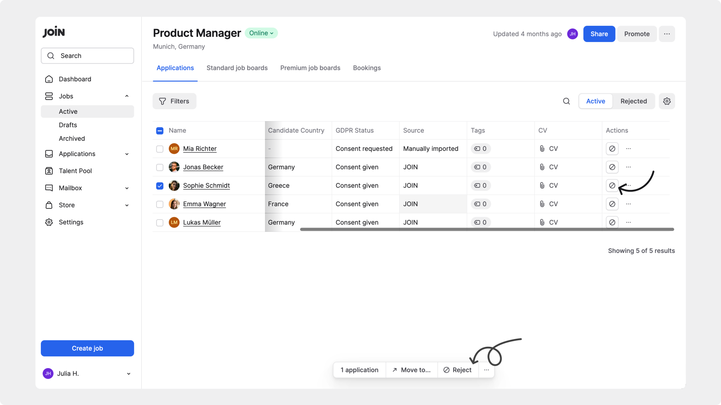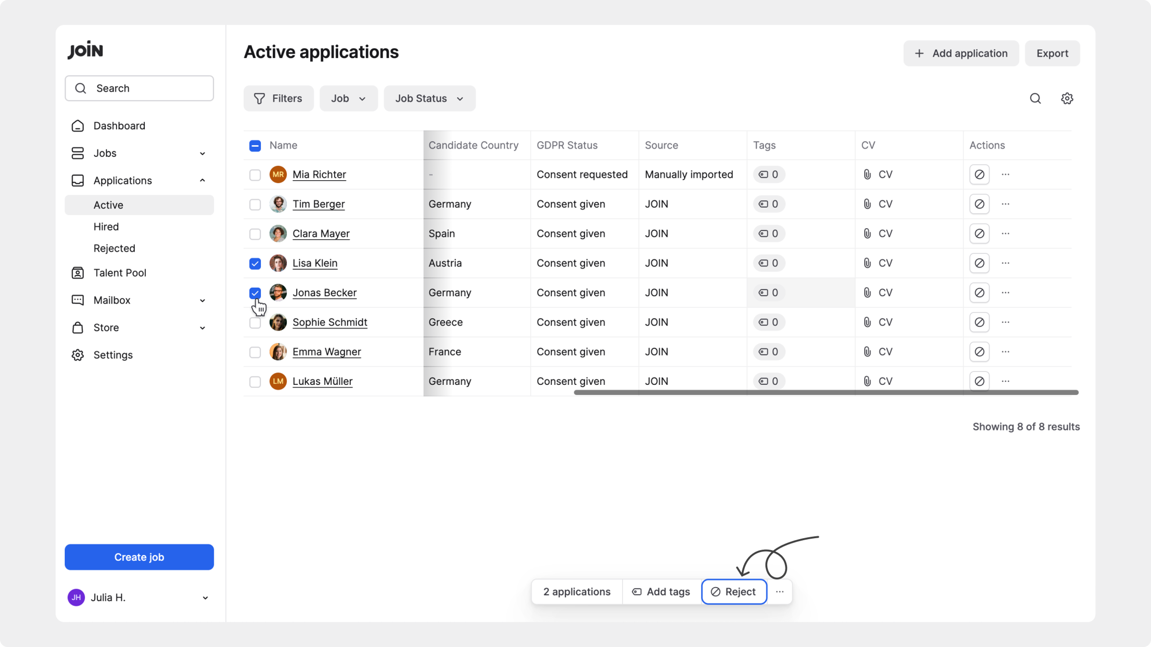 Este artículo te guía paso a paso sobre cómo y dónde puedes rechazar candidatos en JOIN, las diferentes opciones de correo electrónico disponibles y cómo deshacer un rechazo si es necesario.