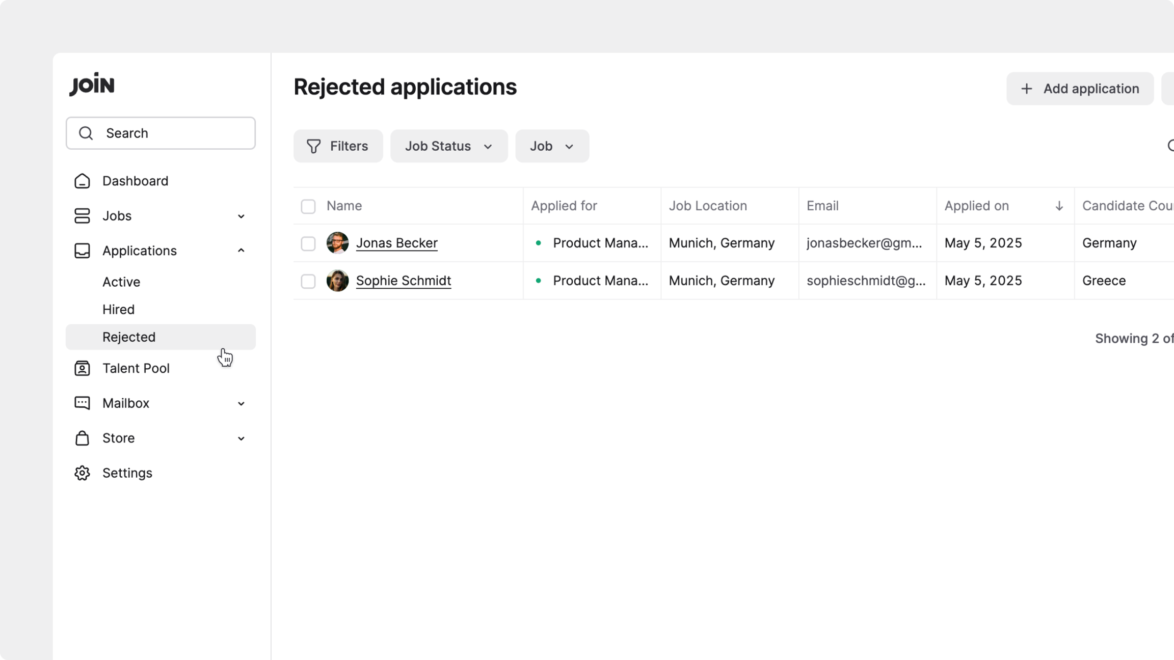 Después de rechazar a un candidato, aún puedes ver su solicitud. Para ver todos los candidatos rechazados en todas tus vacantes, ve a la pestaña Solicitudes en la barra lateral y haz clic en la subpestaña Rechazadas. Esta vista muestra una lista completa de solicitudes rechazadas, independientemente del empleo. Puedes usar los menús desplegables de la parte superior para filtrar la lista por empleo o por estado del empleo, y así encontrar rápido los candidatos que buscas.