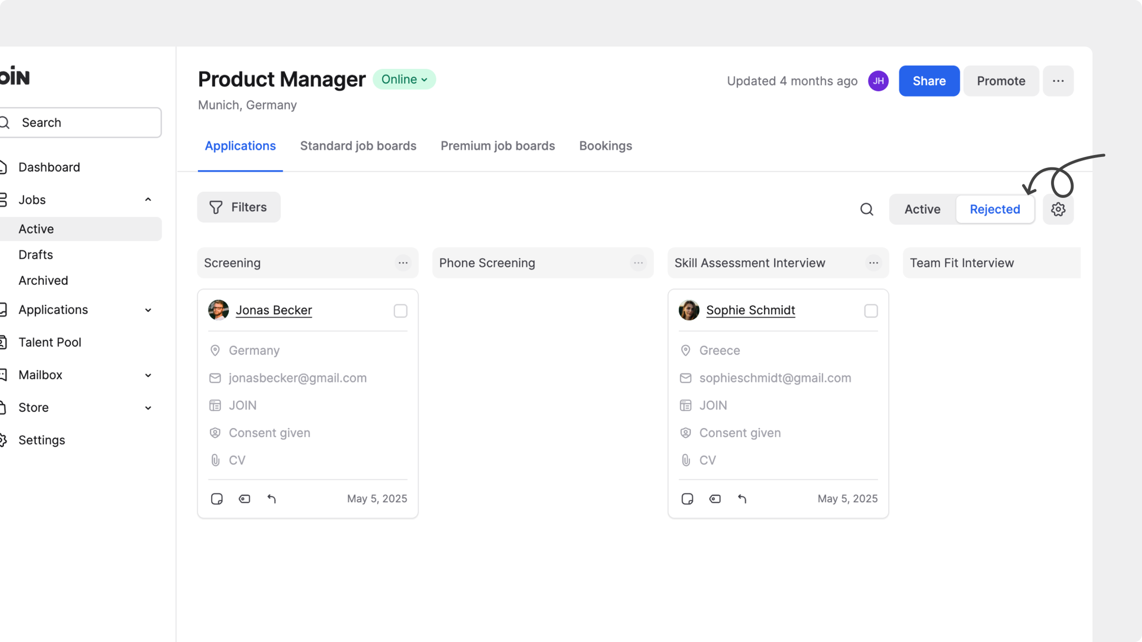 Después de rechazar a un candidato, aún puedes ver su solicitud. Usa el selector Activas o Rechazadas de la parte superior para cambiar entre candidaturas activas y rechazadas en tu pipeline de contratación.