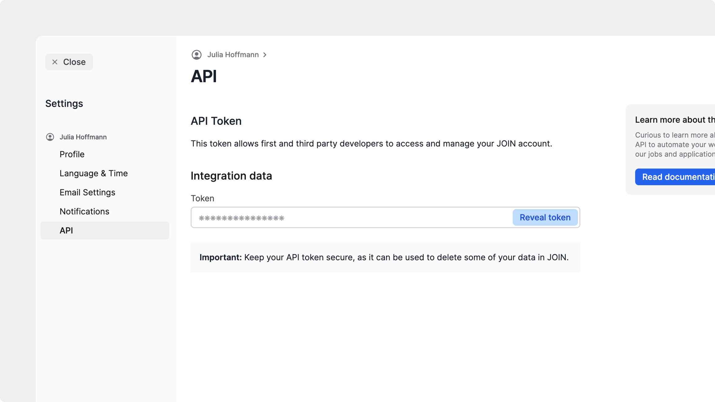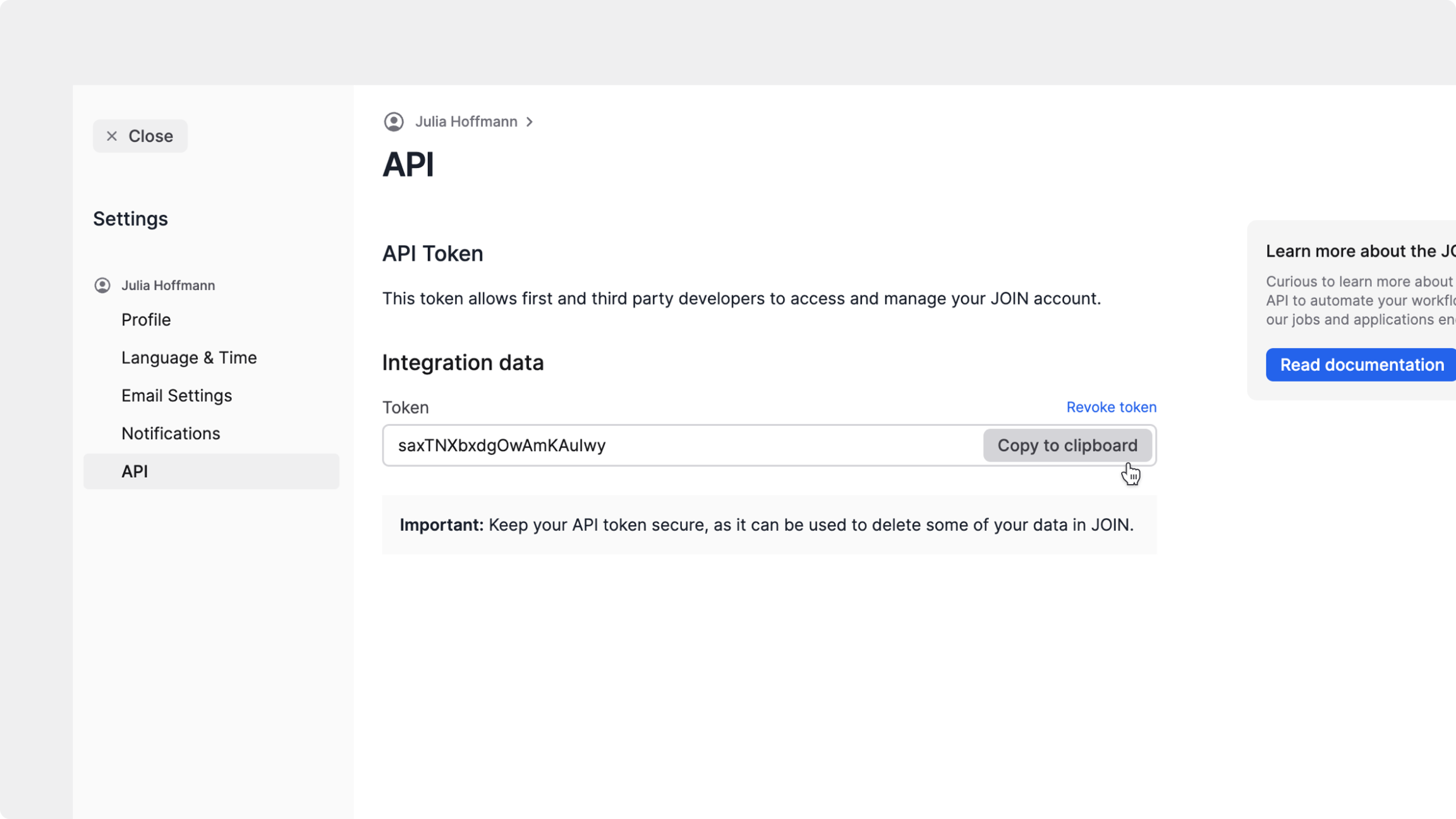 Administrador del sistemapara ver y generar la clave de la API en JOINTendrás que copiar tu token de la API desde tu cuenta de JOIN y pegarlo en Zapier o Make para autorizar la conexión